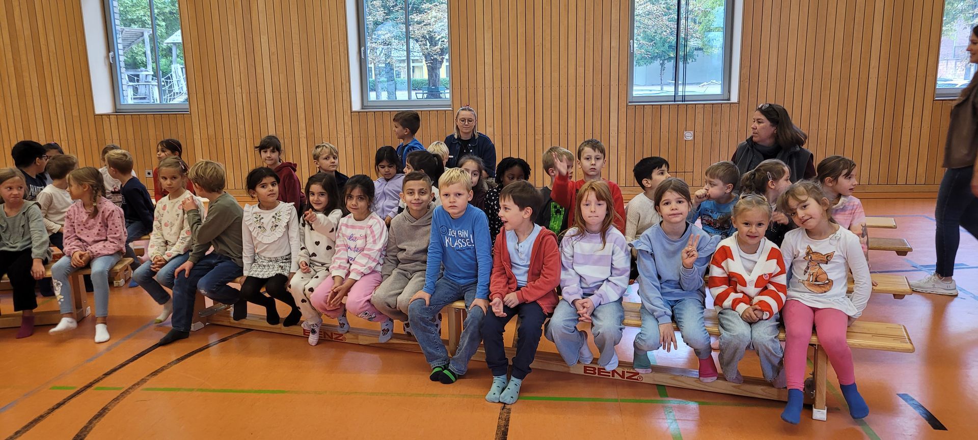 Die Kinder der zweiten Klassen hatten ein schwungvolles Programm vorbereitet, das sie den Bienen der 1a und den Mäusen der 1b und deren Familien vorführten.